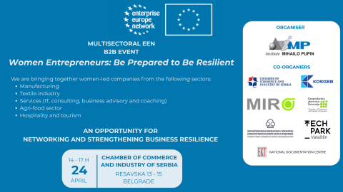 Το Εθνικο Κέντρο Τεκμηρίωσης και Ηλεκτρονικού Περιεχομένου (ΕΚΤ), συντονιστής του Enterprise Europe Network Hellas, συνδιοργανώνει εκδήλωση δικτύωσης για γυναίκες επιχειρηματίες με τίτλο "Women Entrepreneurs: Be Prepared to Be Resilient", την Πέμπτη 24 Απριλίου 2026 (14.00-17.00) στο Βελιγράδι (Εμπο